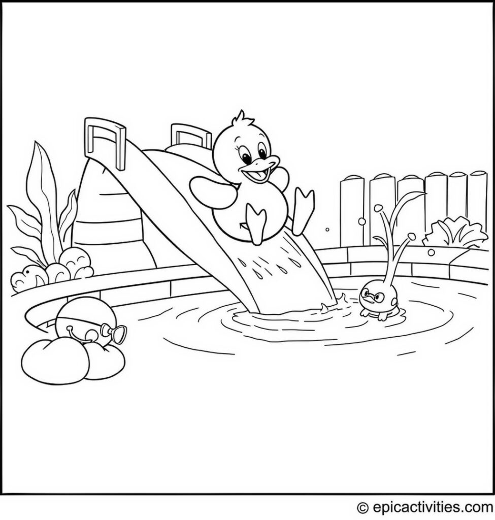 The vibrant colors of the pool, the twisting water slide, and the excited expressions on the duck and its friends’ faces make this coloring page full of energy and excitement.