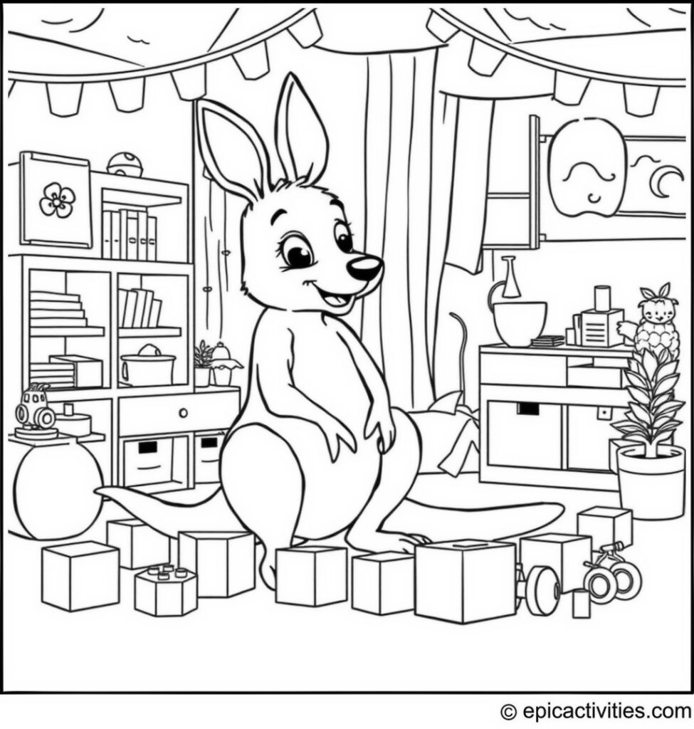 Kangaroos are unique animals from Australia known for their hopping abilities. In this coloring page, a playful kangaroo is having a great time surrounded by colorful toys and blocks.