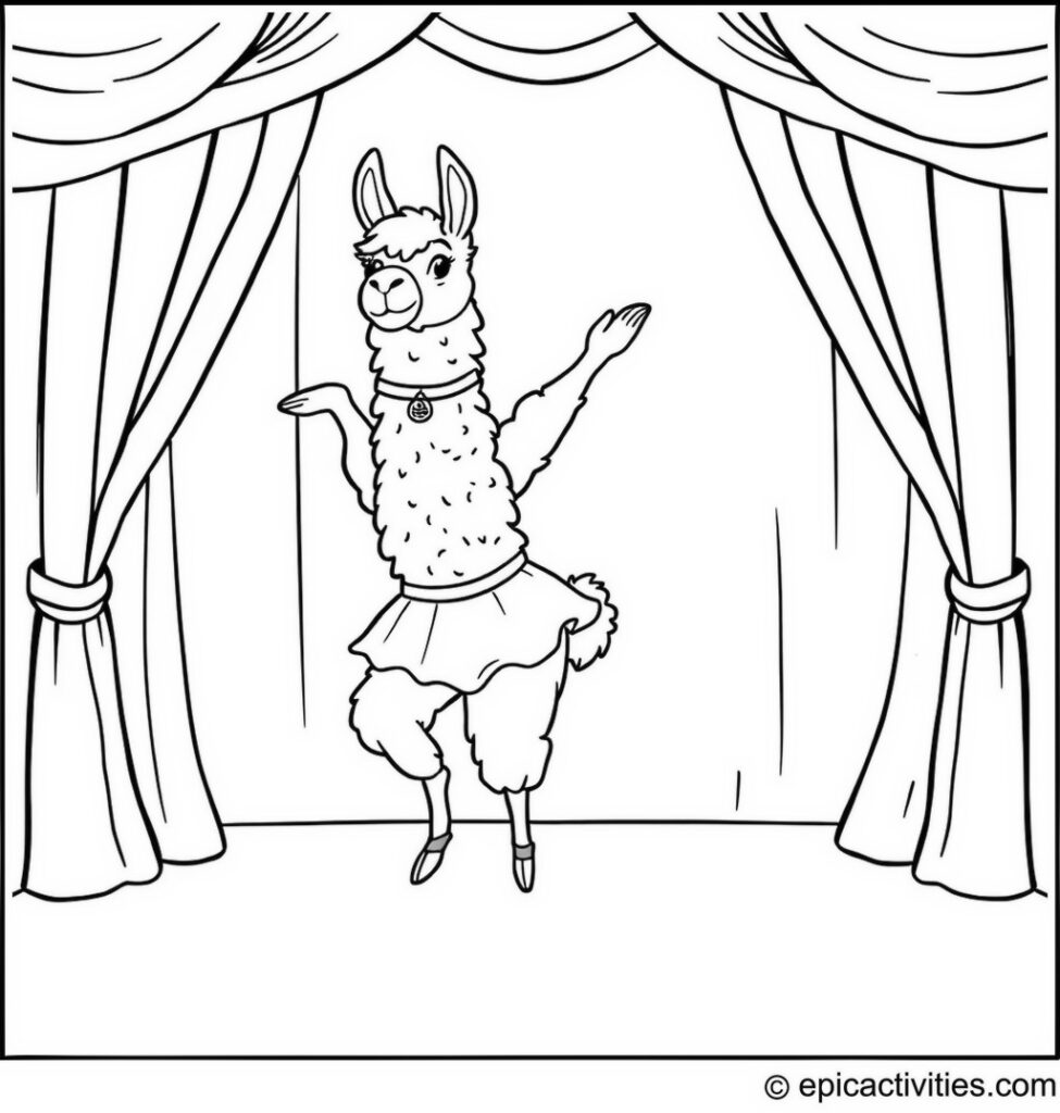 Llamas are friendly animals known for their soft wool and gentle nature. In this coloring page, a llama is showcasing its graceful ballet moves on a colorful stage set with lovely curtains.