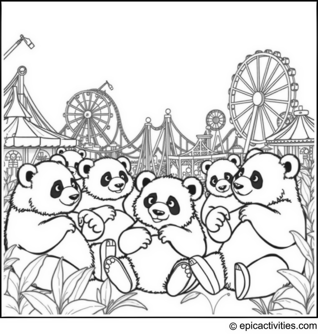 Coloring page of a Group of Playful Pandas at an Amusement Park